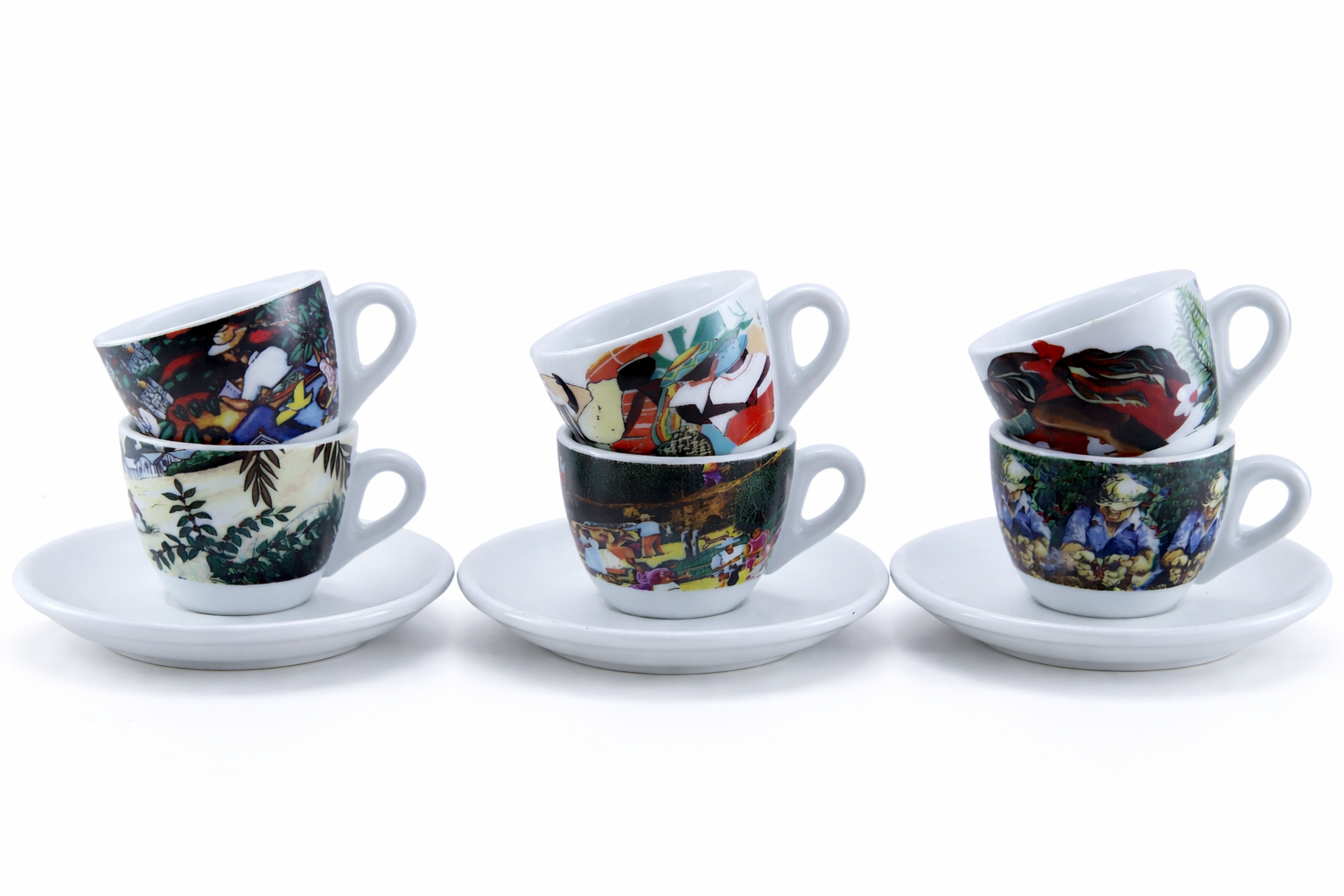 Silnostěnné šálky s podšálky řady ROSA ORIGINI v sérii šesti malovaných kreseb v zářivých barvách, tematicky zobrazujících historii zpracování kávy v zemích s pěstitelskou tradicí.